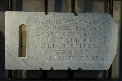 - ISCRIZIONI fronte - D(is) M(anibus). / Mundicius Agatemer / et Mundicius Romanus / ex donatione / fecit sibi et suis / libertis liber/tabusque pos/terisque eoru(m). - Lettere posate maiuscole - Incisione - latino
