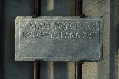 - ISCRIZIONI fronte - C(aius) Marcius, C(ai) f(ilius), Col(lina), / Rufus, vixit ann(os) XVII. - Lettere posate maiuscole - Incisione - latino