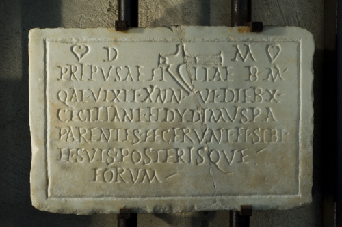 - ISCRIZIONI fronte - D(is) M(anibus). / Prepusae. filiae b(ene) m(erenti). / q(u)ae vixit ann(is) VI, dieb(us) X. / Ceciliane et Dydimus, {pa} / parentes, fecerunt et sibi / et suis posterisque / eorum. - Lettere posate maiuscole - Incisione - latino