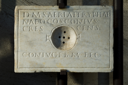 - ISCRIZIONI fronte - D(is) M(anibus) Saeriae Tryphae/nae. Q(uintus) Cosconius / Crescens / coniugi b(ene) m(erenti) fec(it). - Lettere posate maiuscole - Incisione - latino