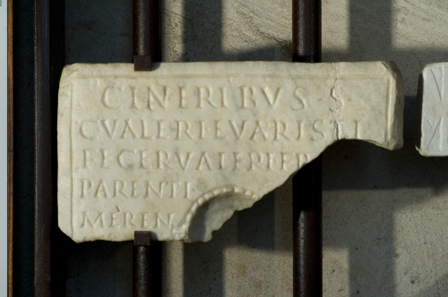 - ISCRIZIONI fronte - Cineribus S(acrum) / C(ai) Valeri Evaristi. / Fecer(unt) Valeri f[ratres] / parenti [bene?] / meren(ti) - - - - - - ? - Lettere posate maiuscole - Incisione - latino