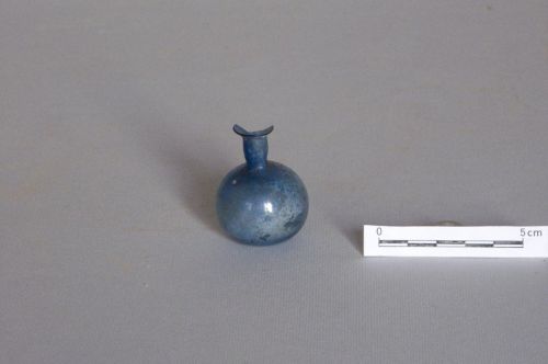 orlo estroflesso con labbro leggermente ingrossato, collo cilindrico con breve strozzatura alla base. Corpo piriforme, base piana. Vetro blu