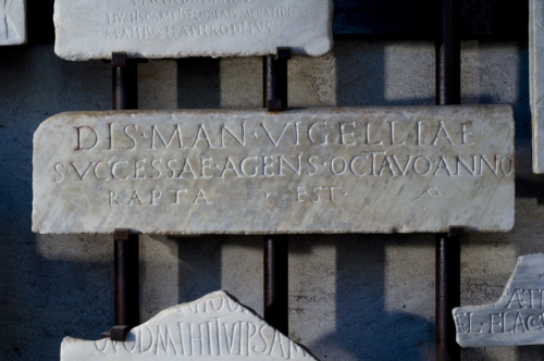 - ISCRIZIONI fronte - Dis Man(ibus) Vigelliae / Successae. Agens octavo anno / rapta est. - Lettere posate maiuscole - Incisione - latino