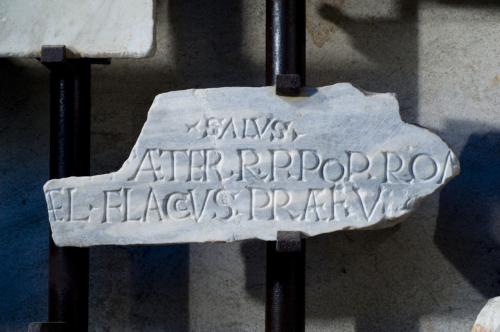- ISCRIZIONI fronte - Salus / Aeterna r(ei) p(ublicae) p(opuli) Rom(ani). / [.] Ael(ius) Flaccus praef(ectus) u(rbi?) [ - - - ]. - Lettere posate maiuscole - Incisione - latino