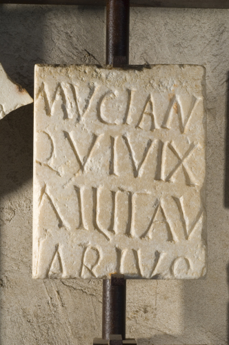 - ISCRIZIONI fronte - [ - - - ]mucian[ - - - ] / qui vix(it) / [ -]ilitav[- - -] / [ - - - - - -] / [ - - - - - -]. - Lettere posate maiuscole - Incisione - latino