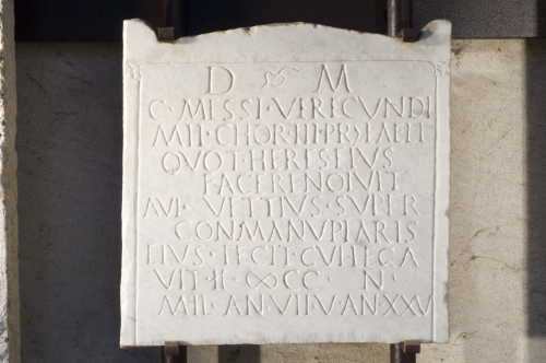 - ISCRIZIONI fronte - D(is) M(anibus) I C(ai) Messi Verecundi / mil(itis) c(o)hor(tis) III pr(aetoriae) | (centuria) Laeli / quot heres eius I facere noluit / Aul(us) Vettius Super I conmanuplaris / eius fecit cui lega/vit H | (milia) CC n(umero) / mil(itavit) an(nos) VII v(ixit) an(nos) XXV. - Lettere posate maiuscole - Incisione - latino