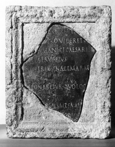 - ISCRIZIONI fronte - [ - - - - - - ] / [ter - - - compraba]verit studium / [ - - - p]lacere uti statua eques- / [tris poneretur quo loco Ti(berio) Caesari Augusto, principi no]stro videretur. / [ - - - Ge]ermanici Caesaris d[e]di[c]a-[retur - - -ad tumulum Neronis Drusi Germani]ci patrui eius. / [ - - -]ur in tribunali marmoreo / [ - - -] / [ - - - ]s poneretur quo loco Ti(berio) / [Caesari Augusto principi nostro, videretur] / [ - - - ]quam ipsa aedificasset [ - - -s]uo loco in quo [ - - -] / [ - - - - - - ]. - Lettere posate maiuscole - Incisione - latino