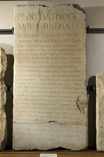 - NOTIZIE STORICO CRITICHE Le prime due righe dell'iscrizione mantengono le forme classiche, mentre nelle altre si notano le forme lunate di epsilon, sigma e omega, oltre al prolungamento in alto di alcuni tratti obliqui e il my di forma corsiveggiante. Likinios Preikos Iouentianos era sommo sacerdote del culto imperiale, agoranomo della sua patria, e si dedicò alla costruzione e al restauro di numerosi edifici sia sacri sia ad uso atletico, impiegando a tale scopo i fondi normalmente versato a titolo di summa honoraria per l'elezione a una carica pubblica. Egli si era precedentemente impegnato, in caso di elezione, ad utilizzare a beneficio pubblico un terreno o un edificio (di cui resta solo l'iniziale "Regli[---]", acquistandolo dalla comunità. Secondo L. Robert si tratterebbe di una stoà in rovina, destinata ad essere ricostruita e a contenere sale per gli atleti che concorrevano alle gare istmiche. Il nome dell'edificio sembra derivare da un latino "Regulianus", forse in ricordo di quel P. Memmius Regulus, che fu legato imperiale in Acaia nella prima metà del I secolo d.C. L'ipotesi del Robert si basa sull'esistenza di un'altra epigrafe di Isthmia, contenente il rescritto del governatore dell'Acaia, in cui si parla della donazione fatta da Preiskos di un denario per ogni cittadino, dell'esistenza di una stoà in rovina e di 50 camere per atleti. Grazie al manoscritto delle "Inscriptiones" di Giovanni Antonio Astori è certo che la stele, tra il 1685 e il 1704, si trovava a Venezia nel palazzo di Giovan Battista Alberghetti.