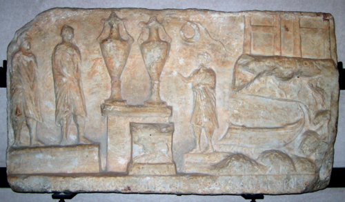 il dedicante Argenidas protende un ramo ai Dioscuri, tra raffigurazioni allusive al luogo di culto,