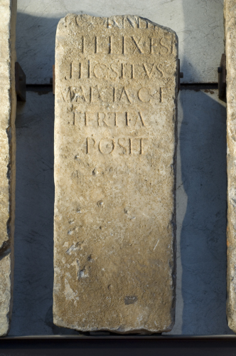 - ISCRIZIONI fronte - Felix est / hic situs. / Maecia, C(ai) f(ilia), / Tertia, / posit. - Lettere posate maiuscole - Incisione - latino