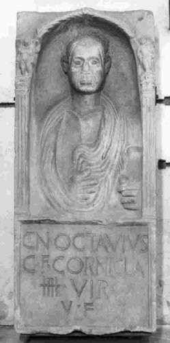 - ISCRIZIONI fronte - Cn(aeus) Octavius, / C(ai) f(ilius), Cornicla, / IIIIvir. / V(ivus) f(ecit). - Lettere posate maiuscole - Incisione - latino