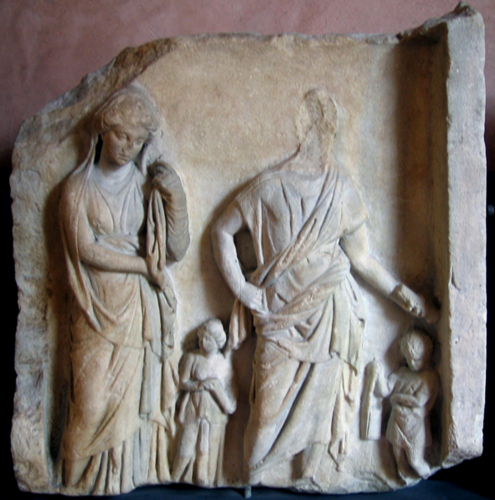 - NOTIZIE STORICO CRITICHE L'iconografia del personaggio maschile trova confronti tra le stele microasiatiche, soprattutto di Smirne, soprattutto per la predilezione per i panneggi complicati. La presenza del rotolo qualifica il personaggio come uomo di cultura. Più diffuso è l'atteggiamento della figura muliebre, che richiama quello della Pudicitia, nella variante cosiddetta Baebia; per quanto riguarda il panneggio, anche per questa figura si possono addurre confronti con altri tipi di figure femminili presenti sovente nelle stele dellAsia Minore.
