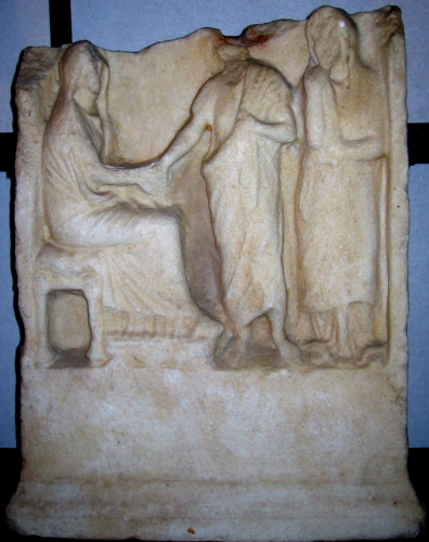 gesto di dexiosis tra una figura femminile seduta su un sedile e (di fronte) una figura maschile stante in posizione frontale; accanto (a sinistra) una figura femminile stante in posizione frontale,