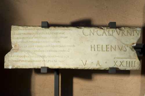 Iscrizione greca: a Floros. Iscrizione latina sulla fronte: a Gn. Calpurnius Helenus e un'altra scrizione latina sul retro: a Caedicia Chreste (iscrizioni lastra rettangolare con iscrizione greca (metà sinistra); iscrizione latina (metà destra); iscrizione latina (sul retro))