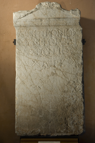 - ISCRIZIONI fronte, sulla metà superiore - L. Petronios/ Symphoros,/ di diciannove anni/ salve - Incisione - greco