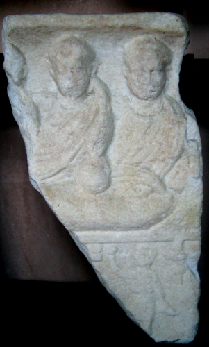 - NOTIZIE STORICO CRITICHE Le pupille incise e rivolte verso l'alto offrono un indizio per la datazione all'età imperiale avanzata. Il rilievo è seguito con una certa rozzezza e la Felder ha addotto come confronto un pezzo assai simile con la raffigurazione del consueto banchetto funerario a due personaggi conservata a Paro e che la studiosa attribuisce alla medesima officina del pezzo in esame.