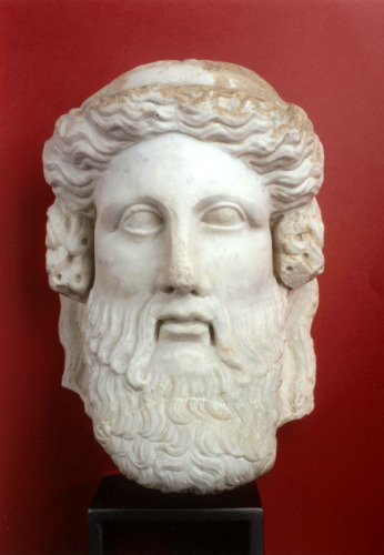 Testa raffigurante una divinità barbata (Hermes), coronamento di un pilastrino/erma usato come sostegno, come indica la presenza di un incavo quadrangolare sulla sommità del capo. Il volto è levigato e regolare, con la fronte alta, gli occhi caratterizzati dalle palpebre rilevate, la bocca è piccola e socchiusa ed è inquadrata dai lunghi baffi che scendono ai suoi lati terminando in un lungo ricciolo attorcigliato. La barba è organizzata con cura e disposta in modo quasi arcaizzante, in almeno tre file di ciocche (due conservate). I capelli, che aderiscono al cranio grazie a un largo stróphion, sono organizzati in lunghe ciocche intorno al vertice occipitale del capo mentre la frangia è bipartita dalla scriminatura centrale.