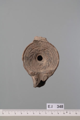 ventre troncoconico con spalla inclinata verso l?interno, decorata da due circonferenze concentriche incise che racchiudono un motivo decorativo in rilievo costituito da punti alternati a due trattini verticali che si interrompono in corrispondenza di due elementi orizzontali in rilievo. Il disco concavo con infundibulum leggermente decentrato verso l?alto è decorato da una corona d?alloro. Il becco è decorato da due teste d?uccello contrapposte. Sulla parte posteriore della lucerna è impostata verticalmente un?ansa a nastro di cui rimane solo l?attacco. Il fondo è piatto.