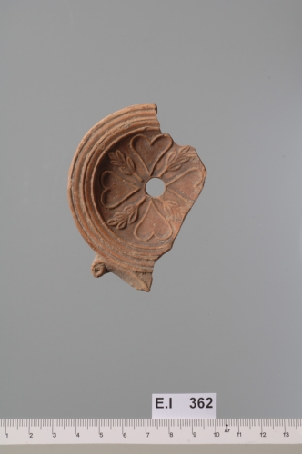 lucerna con serbatoio troncoconico schiacciato, spalla inclinata verso linterno decorata da quattro cordoli in rilievo, disco concavo ornato da quattro foglie cuoriformi disposte a croce intorno allinfundibulum, inframezzate da rametti di alloro. Del becco si conserva solo parte di una voluta desinente a ricciolo. Corpo ceramico arancio chiaro depurato, rivestito da una vernice color bruno scuro.