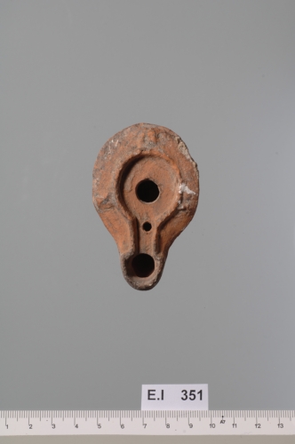 spalla larga e piatta, dal profilo irregolare, ornata da tre borchiette solcate al centro; disco liscio e subcircolare con infundibulum centrale e forellino di sfiato posto all?inizio del canale. Base leggermente concava. Intorno al foro di bruciatura vi è un?area di riduzione di colore nerastro.Corpo ceramico arancio depurato.