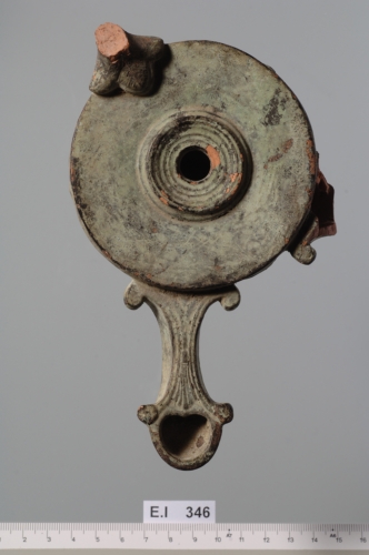 lucerna bicline su piede sagomato nella parte superiore, con vasca globulare decorata da delicati racemi vegetali terminanti in fiori di loto e campanelle e disco piatto con infundibulum centrale circondato da sette circonferenze concentriche in rilievo. L'ansa è spezzata all'attacco decorato da una palmetta in rilievo. Uno dei due becchi, con terminazione cuoriforme presenta una doppia voluta fortemente plastica ed è decorato nella parte superiore da una palmetta in rilievo e in quella inferiore da una palmetta che nasce da un fiore, motivo che in dimensioni ridotte si ripete sul serbatoio tra i due becchi; del secondo becco rimane solo l'attacco al serbatoio. Corpo ceramico arancio chiaro rosato ricoperto da una patina verdastra.