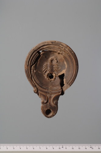la lucerna presenta lacune sul disco e sul serbatoio di forma troncoconica rovesciata. La spalla, leggermente inclinata, è ornata da tre solcature concentriche e tre cordoli (IIIa). Sul disco concavo è rappresentato uno scorpione volto verso il basso, con le chele anteriori poste a semicerchio attorno all'infundibulum, leggermente decentrato verso il basso e la coda alzata. La base piatta è delimitata da una circonferenza.Corpo ceramico depurato nocciola ricoperto da una vernice bruna opaca.