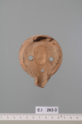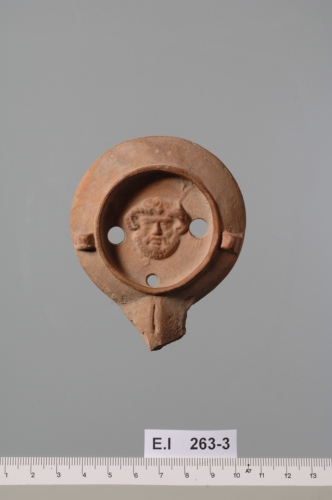 lucerna a canale chiuso con spalla larga, estroflessa e dotata di due borchiette piramidali. Il disco, ribassato, ha un alto bordo ed è decorato dalla testa di Giove Ammone con corna di ariete ricurve, folta barba e capigliatura ricciuta. A sinistra e a destra del rilievo sono praticati due infundibula . Al limite del disco è presente un piccolo foro di sfiato. Corpo ceramico depurato di color arancio rosato.