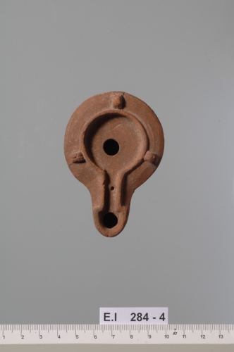la spalla leggermente estroflessa è ornata da tre borchiette solcate al centro. Il disco liscio e ribassato presenta un infundibulum appena decentrato verso sinistra. A metà del canale è praticato un forellino di sfiato, mentre sulla base, racchiusa da due circonferenze impresse, compare il marchio di fabbrica IEGIDI a lettere rilevate e apicate tra due cerchietti impressi nella parte superiore e uno nella parte inferiore. Corpo ceramico arancio depurato con ingobbio di colore più scuro.