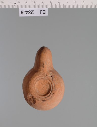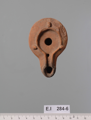L?esemplare presenta la spalla leggermente estroflessa, ornata da tre borchiette. Sul disco, lievemente ribassato è aperto l?infundibulum centrale mentre all?inizio del canale del becco è ricavato un foro di sfiato. Intorno al foro di bruciatura si nota un'area di riduzione di colore nerastro. La base, concava e anepigrafe è delimitata da due circonferenze impresse. Corpo ceramico arancio depurato e ingobbiato.