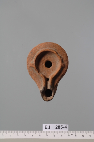 La spalla, leggermente estroflessa, presenta due borchiette scanalate mal sagomate. Sul disco, appena ribassato e a profilo circolare, è ricavato l?infundibulum. All?inizio del canale è aperto il foro di sfiato decentrato a sinistra e intorno al foro di bruciatura sono presenti piccole tracce di riduzione. Sul fondo poteva esserci un bollo che però risulta illeggibile. Corpo ceramico depurato di color arancio rosato.