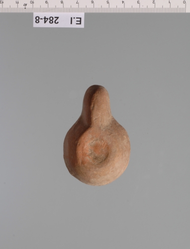 esemplare con palla leggermente estroflessa ornata da tre borchiette mal sagomate. Il disco, di forma subcircolare è totalmente mancante. La base leggermente concava è anepigrafe. Corpo ceramico depurato di color arancio rosato con tracce di vernice rosso bruna.