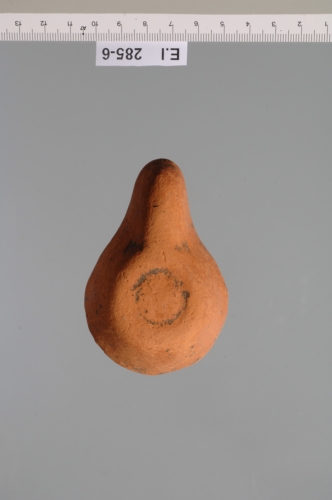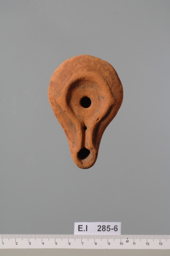 esemplare di forma ovoidale con spalla leggermente estroflessa, ornata da due borchiette mal sagomate. Il disco di forma ovoidale presenta un infundibulum leggermente decentrato a sinistra, mentre un foro di sfiato è ricavato all?inizio del canale. La base è anepigrafe. Corpo ceramico arancio depurato e ingobbiato