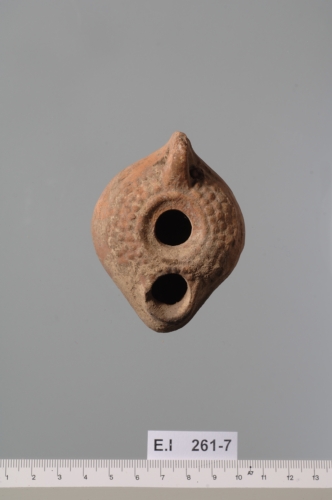 La spalla estroflessa è ornata da quattro file di perline rilevate e mal sagomate; il disco piccolo e lievemente concavo, è delimitato da un anello in rilievo e reca un grande infundibulum centrale. L?ansa forata probabilmente costolata è opposta al grande becco completamente occupato dal foro di bruciatura intorno a cui si nota un'area di riduzione di colore nerastro. La base, piatta, è racchiusa da un cordolo che continua con una nervatura fino all?ansa.Corpo ceramico depurato di color arancio rosato con tracce di vernice rosso bruna opaca.