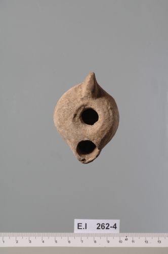 La spalla estroflessa, presenta deboli tracce di granulazione (forse tre file si perline in rilievo ormai poco visibili); il disco piccolo e lievemente concavo, è delimitato da un anello in rilievo e reca un grande infundibulum centrale. La presa piena è opposta al grande becco completamente occupato dal foro di bruciatura intorno a cui si notano tracce dell?area di riduzione di colore nerastro. La base, piatta, è racchiusa da un cordolo che continua con una nervatura fino all?ansa. Corpo ceramico depurato giallo poco intenso.