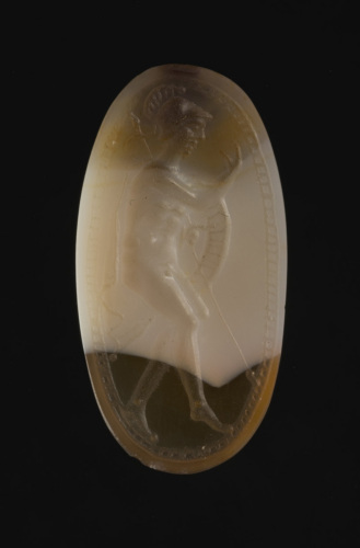 In un'agata zonata di forma ovale allungata è inciso un guerriero nudo con mantello allacciato attorno al collo, leggermente chiono in avanti, in atto di avanzare verso destra, con caratteristica andatura in punta di piedi; con la mano destra, rivolta verso il viso, compie un gesto particolare: indice e pollice sono sollevati e aperti, tutte le altre dita chiuse a pugno. Il guerriero nella mano sin.regge lo scudo e l'asta.In capo ha un elmo con ricco lophos. Il campo di incisione è racchiuso da un bordo zigrinato, su cui il personaggio posa i piedi (manca la linea del suolo).