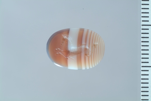 In un'agata zonata è inciso, in senso orizzontale, un cavallo marino,di profilo verso sin..Lavorazione estremamente accurata, caratterizzata da piccoli globuli per rappresentare gli zoccoli e gli snodi delle zampe. Il corpo dell'animale fantastico è decorato con una serie di piccoli tratti disposti a spina di pesce; la coda serpentiforme si incurva per sollevarsi poi verso l'alto; una piccola pinna sul dorso; la criniera, delineata da una linea curva, è segnata da piccoli tratti paralleli.