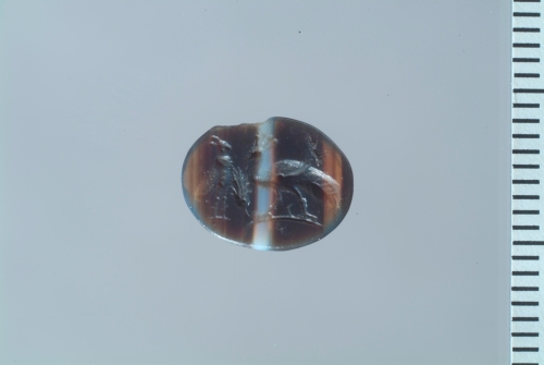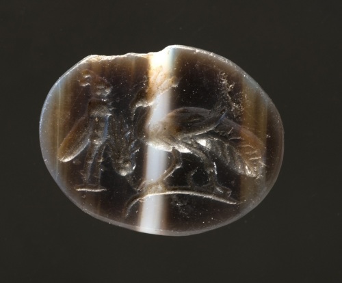 - NOTIZIE STORICO CRITICHE L'intaglio può forse essere inserito fra le composizioni, di moda in età tardorepubblicana e protoaugustea, costituite da animali e simboli, che rappresentano probabilmente "motti o imprese personali certamente dettati dai committenti" (Sena Chiesa 1997, p. 131)