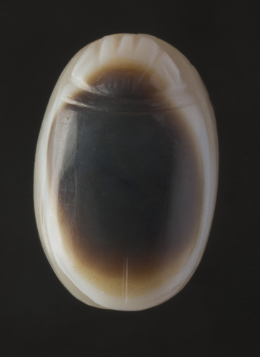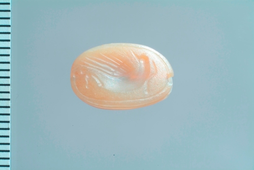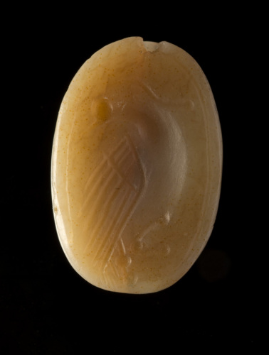 Scarabeo in agata zonata, con intaglio sul lato piano. Dello scarabeo sono indicati solamente il capo e le elitre. Sulla faccia inferiore, nel campo di incisione delimitato da un solco, è raffigurato un uccello retrospiciente(pavone?), di profilo verso destra. La piccola testa è resa con un globulo, così come i dettagli delle zampe, mentre le ali sono ottenute con solchi paralleli