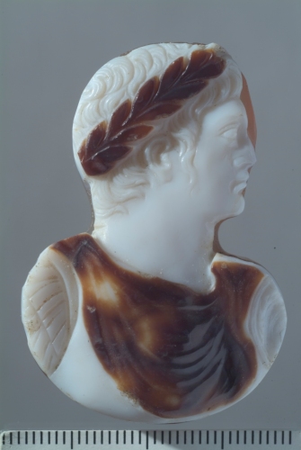 - NOTIZIE STORICO CRITICHE Il cammeo, che era conservato nello scrigno della Sala del Consiglio dei Dieci (Pellegrini 1593, n. 52), è costituito dalla "sola forma del busto...incastonato in fondo ellittico di metallo ignobile", come ricorda Valentinelli 1872, p. 64 (cfr. anche Ravagnan 1997, p. 240). La datazione del cammeo si presenta problematica: a fianco di una cronologia antica (I secolo d.C.: Ravagnan, Nardelli), è stata proposta anche un'appartenenza del pezzo alla produzione post-antica (Platz-Horster 2002, p. 59).
