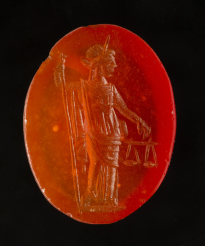 Su una corniola ovale è raffigurata Aequitas, stante su breve linea del suolo,di prospetto,con la testa diademata di profilo verso destra. Indossa un lungo chitone ed un mantello che le serra i fianchi e un cui lembo scende dalla spalla destra. Con il braccio destro, piegato ad angolo retto, si appoggia a una lunga asta o scettro puntato al suolo, mentre con la mano sinistra abbassata regge la bilancia.