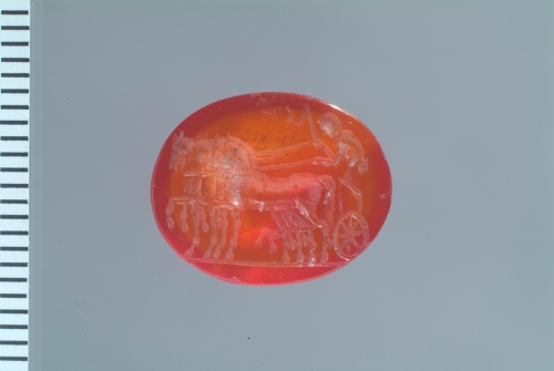 In una corniola ovale si dispone in senso orizzontale, su una lunga linea del suolo, una quadriga, con i cavalli al passo, rappresentati di profilo. Sempre di profilo, l'auriga, in piedi sul carro (schematicamente rappresentato: si noti in particolare la grande ruota con otto raggi) in atto di guidare i cavalli reggendo fra le mani le briglie e, con la destra, la frusta.