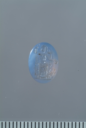In un calcedonio azzurro, è raffigurato Giove seduto in trono di prospetto, con il busto nudo e le gambe avvolte nel manto. Nella mano sin. protesa regge la patera e con il braccio destro alzato e piegato ad angolo retto impugna lo scettro, puntato al suolo. In basso a destra, sulla linea del suolo, si vede l'aquila, con la testa rivolta verso il dio.