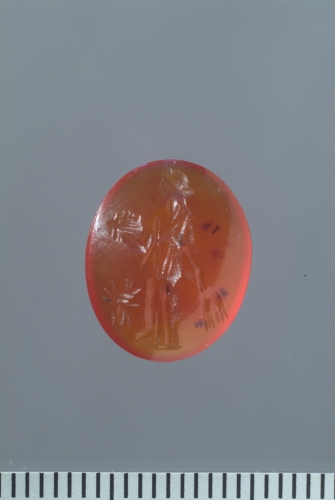 In una corniola di forma ovale è raffigurata Cerere di tre-quarti, con la testa di profilo verso sinistra, stante su una breve linea del suolo. La dea indossa un lungo chitone con cintura e lungo apoptygma. Con il braccio sinistro abbassato tiene due spighe rivolte verso il basso, mentre il braccio destro, piegato e sollevata, regge una patera colma di frutti. A sinistra in basso è raffigurata una formica di grandi dimensioni. La dea è raffigurata come Fides Publica, soggetto ben attestato nei coni monetali.