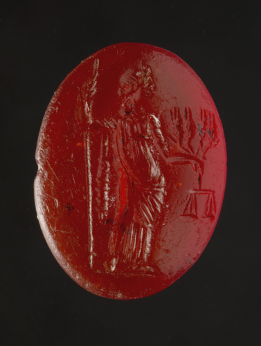 Su una corniola ovale è raffigurata Aequitas, stante su breve linea del suolo,di prospetto,con la testa diademata di profilo verso destra. Indossa un lungo chitone ed un mantello che le serra i fianchi e un cui lembo scende dalla spalla destra. Con il braccio destro, piegato ad angolo retto, si appoggia a una lunga asta o scettro puntato al suolo, mentre con la mano sinistra regge la bilancia e quattro spighe rivolte verso l'alto.