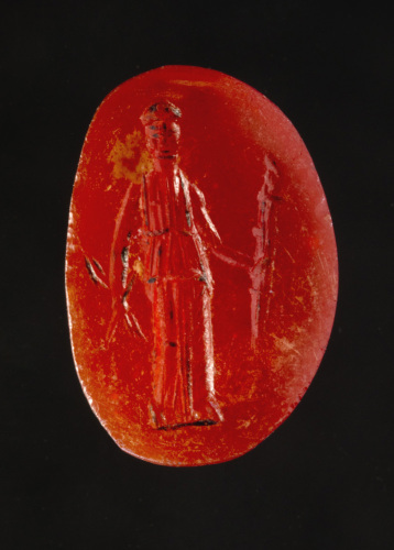 In una corniola dalla forma ovale non molto regolare, è rappresentata, su una breve linea del suolo, una figura femminile stante di prospetto in lunga veste; da notare la testa, coperta da un copricapo o diadema, resa anch'essa di prospetto, contrariamente alla norma che prevede il volto di profilo. Il personaggio con il braccio sinistro piegato tiene in mano una fiaccola, rivolta verso l'alto, mentre con il destro abbassato regge un arco (?). I due attributi, fiaccola e arco, rimandano all'iconografia di Artemide Diana, sincretizzata con Ecate.
