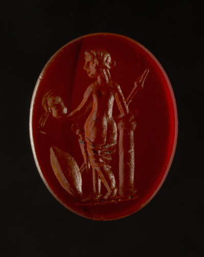 In una corniola è raffigurata Venere Vincitrice. La dea è stante su una breve linea del suolo, di tre-quarti di schiena, con le gambe avvolte in un manto, che le lascia scoperti i glutei; la testa è volta di profilo a sinistra; la gamba sinistra, flessa e portata all'indietro, sfiora il suolo con la punta del piede; con il braccio sinistro piegato e con il gomito poggiante su un pilastrino regge una lancia, che attraversa obliquamente l'immagine, mentre con il destro allungato sostiene un elmo dal lungo lophos; in basso a sinistra poggia uno scudo. Da notare lo stile accurato dell'intaglio