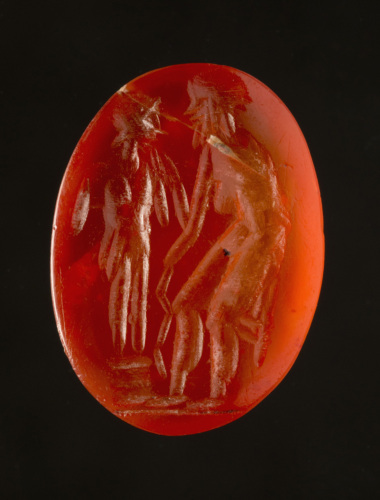 - NOTIZIE STORICO CRITICHE Un confronto pertinente di età antica (corniola di Vienna del I sec. a.C.) potrebbe far riconoscere nel personaggio barbato Prometeo o uno scultore. Per quanto riguarda la datazione, sembra plausibile ipotizzare un inquadramento dell'intaglio nella produzione glittica post-antico, soprattutto a causa dello stile e di alcune "irregolarità" iconografiche.