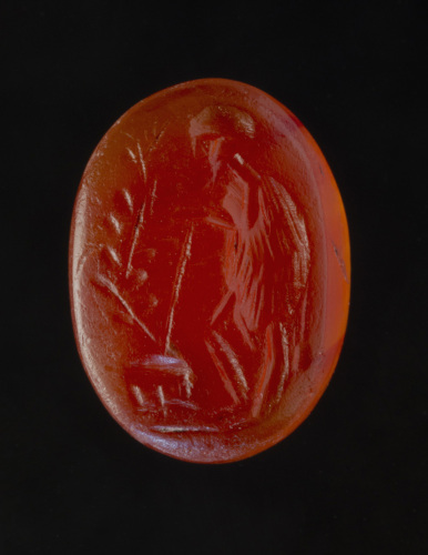 In una corniola di forma ovale è incisa una figura maschile stante su una breve linea del suolo, di profilo verso sin. Il personaggio, caratterizzato da calvizie e barba a punta, indossa una corta tunica e mantello di pelle, di cui si nota la coda dell'animale scendere dietro la schiena fino a sfiorare il polpaccio); con entrambe le mani si appoggia su un bastone puntato al suolo. Di fronte, un albero fogliato, alla base del quale si trova un elemento di difficile identificazione. L'iconografia è quella tipica del pastore (tipo Faustolo), ma colpisce l'assenza dell'animale ai piedi dell'albero: sembra quasi che l'incisore non abbia capito (o abbia stilizzato all'eccesso) l'immagine da riprodurre. Da notare anche la posizione delle gambe, una piegata e l'altra flessa (solitamente sono incrociate).
