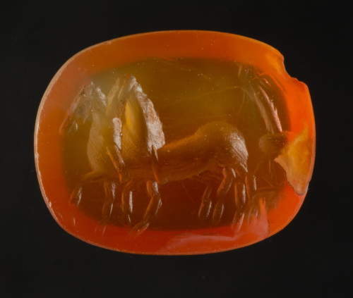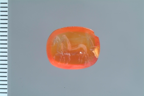Disposta in senso orizzontale, in una corniola è raffigurata di profilo verso sin, in maniera assai schematica, una biga, guidata da un personaggio alato, forse Vittoria, che regge le briglie e la frusta. Il corpo dell'auriga è reso con un unico solco, leggermente curvo; le ali sono rappresentate da semplici linee spezzate.