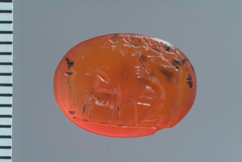 Su una corniola ovale è disposta, in senso orizzontale, una scena di mungitura su una lunga linea del suolo. A sinistra un contadino barbato, di profilo verso destra, è curvo in avanti e inginocchiato, con il ginocchio sinistro poggiato al suolo; entrambe le braccia sono allungate in avanti per mungere una capra retrospiciente, anch'essa rappresentata di profilo. La scena è chiusa a destra da un albero fogliato, che si curva seguendo il margine della pietra, e a sinistra da una colonnina.